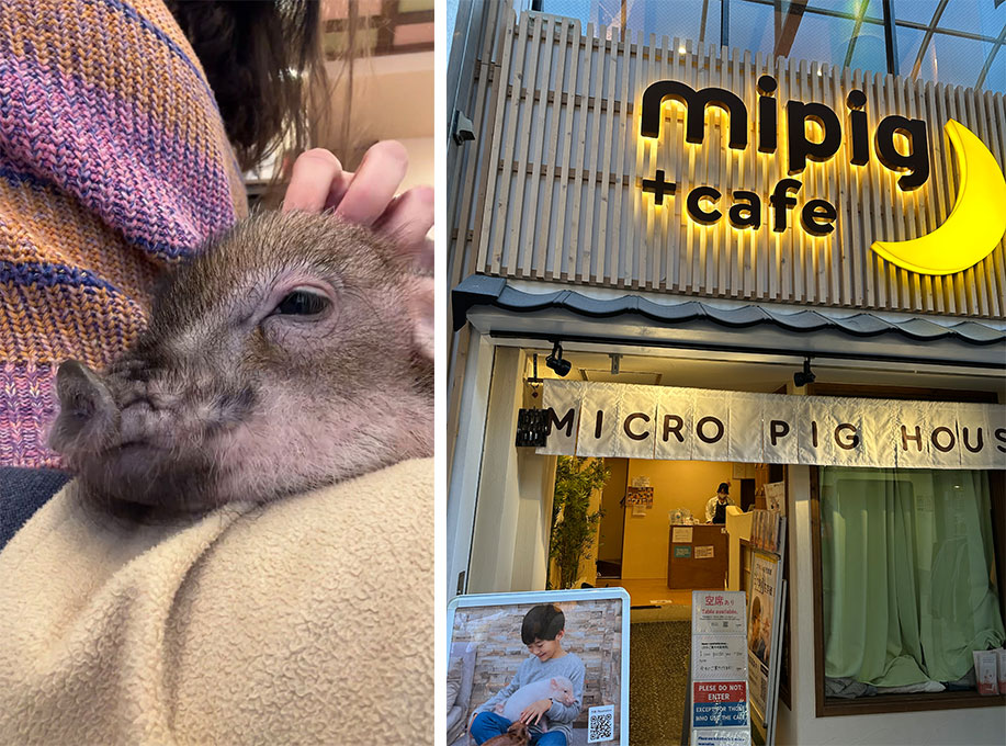 A rede Mini Pig Café possui 20 lojas espalhadas pelo Japão. Como o nome já diz, é lar de adoráveis porquinhos em miniatura de uma raça originária do Reino Unido, conhecidos por serem inteligentes e muito dóceis. Assim que entramos no salão — sem sapatos — recebemos um cobertor para colocar no colo e logo os porquinhos chegam para se aconchegar.